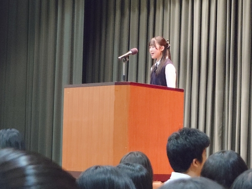 初めに校長先生から「見分を広げてほしい」「高校時代の友は一生の友。思い出に残る旅を!」「多くの方々に感謝の気持ちを忘れずに!」「この時期に行う修学旅行には意味がある」などのお話の後、日本旅行の方々や同行していただく写真館の方からもお言葉をいただきました。生徒を代表して生徒会長からあいさつがあり、学年副主任・生徒指導部からはホテルのマナーや観光地でのルール、時間厳守、服装などの諸注意がありました。最後に学年主任の太田先生から「個人の旅行ではない。全員が平等に楽しめる修学旅行にしてください」と話しをし、締めくくられました。