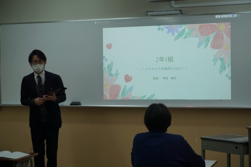 特進Sコースの責任者と学級担任より、大学進学にあたっての様々な入試制度についての説明、特進Sコースからの受験方法や、難関国公立大学・難関私立大を受験するにあたって、これから本格的に取り組むべきことをお話ししました。