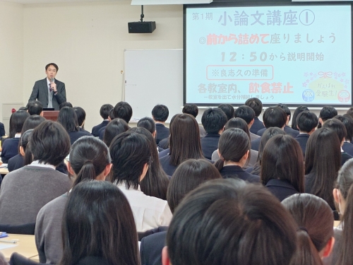 本日、3月6日(金)より、新3年生を対象に小論文講座がスタートしました。今年は昨年以上に受講人数が多く、230名以上の生徒が出席となり、大会議室だけでは収容できないため、別教室にもその講義内容をプロジェクターを通して中継し、リモートで講義を受ける形を導入しました。また添削をする教職員も各教室へ分かれて、同時並行で授業を受ける形をとっています。このように同じ講義を受けた生徒と先生が一体となり、小論文に取り組むという姿勢を本校では大切にしています。