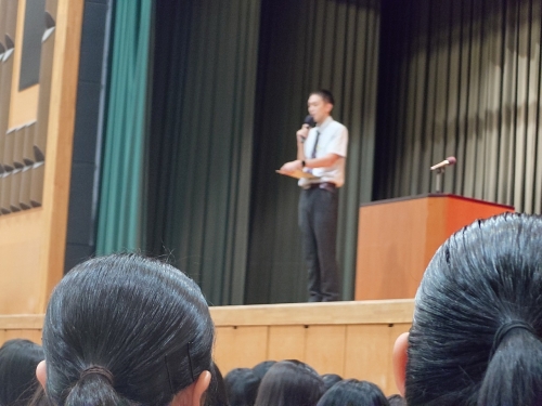 初めに校長先生から「見分を広げてほしい」「高校時代の友は一生の友。思い出に残る旅を!」「多くの方々に感謝の気持ちを忘れずに!」「この時期に行う修学旅行には意味がある」などのお話の後、日本旅行の方々や同行していただく写真館の方からもお言葉をいただきました。生徒を代表して生徒会長からあいさつがあり、学年副主任・生徒指導部からはホテルのマナーや観光地でのルール、時間厳守、服装などの諸注意がありました。最後に学年主任の太田先生から「個人の旅行ではない。全員が平等に楽しめる修学旅行にしてください」と話しをし、締めくくられました。