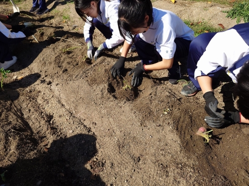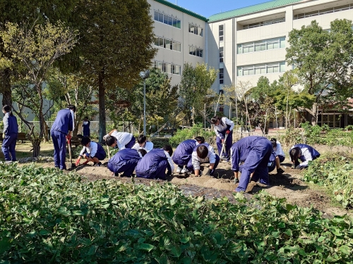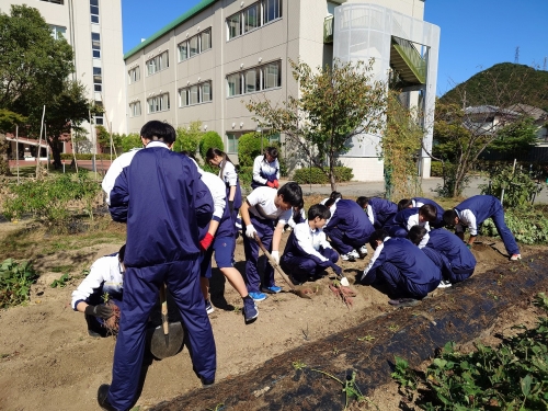 10/23木曜日の4校時目に「課題研究・SDGs」の授業で、本校中庭(自彊園)内にある畑にて、サツマイモ掘りを行いました。サツマイモを掘る前に先生より、「サツマイモを掘る際に大量の蔓(つる)が残ってしまう。今までなら、地中に埋めるなり、捨てるなりしていたのだが、この大量の蔓を何かに使えないか、商品価値をつけることができないかと考えながら、サツマイモを掘ってください。」と前置きがありました。