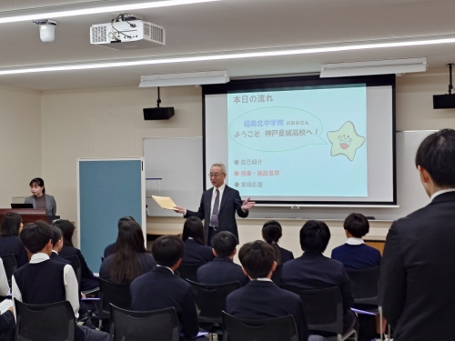 本日(11/5・水曜日)、加古郡稲美町にある「稲美北中学校」の2年生18名と引率の先生が、神戸星城高校を訪れてくれました。到着後、本校職員がお出迎えし、1階にある大会議室に案内しました。その後、5階のライブラリーや4階のコンピュータ室、3階の1年1組の英語の授業を見学し、2階の講堂やカフェテリアを案内しました。