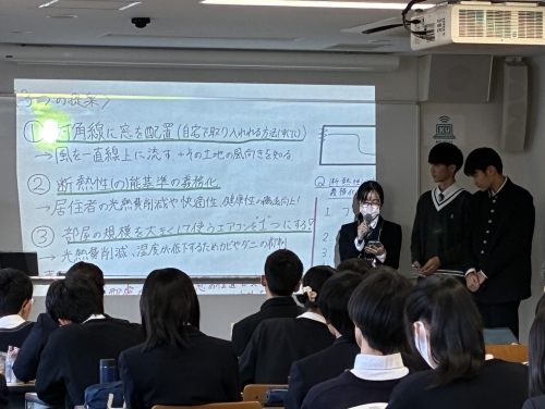 本校生徒は、YKK AP株式会社による「『窓』から考えるサステナビリティ」をテーマとした講演を聴講し、「これからの家づくりがどうなっていけば環境を守ることができるのか」「住まい手である私たち一人ひとりが意識するべきこと」について、他校の生徒5~6人とチームを組んでグループディスカッションを行いました。