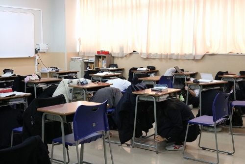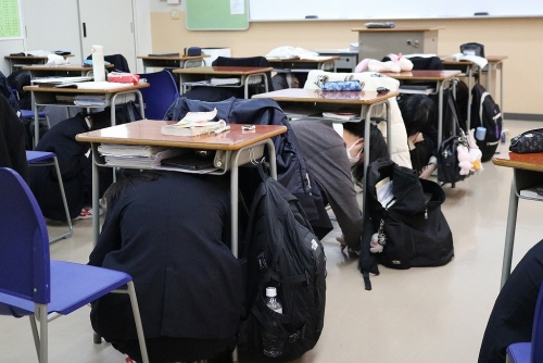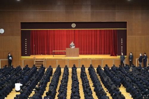 1月13日(火)、地震による火災の発生を想定した避難訓練を実施しました。安全確保・避難経路の確認・迅速で正確な点呼を実施目的に、校内放送で避難訓練を行い、全学年が体育館に集合しました。