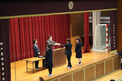 校長先生のお話に先立ち、31年前の阪神・淡路大震災で犠牲になられた方々のご冥福をお祈りし、黙祷を捧げました。その後、第3学期学級委員任命式が行われました。